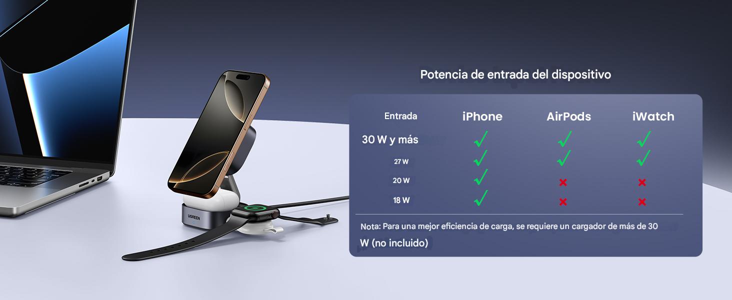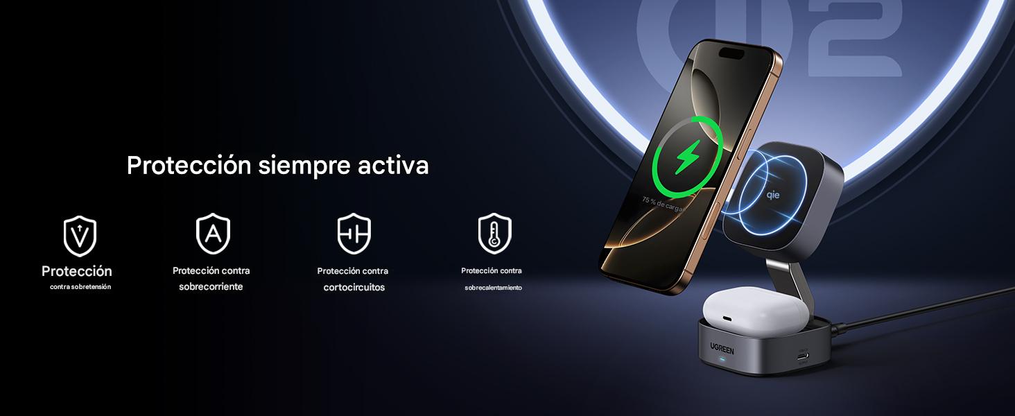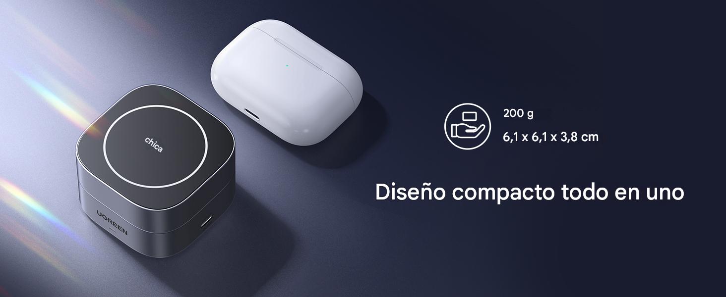 El cargador inalámbrico magnético UGREEN W702 te permite cargar tu iPhone, AirPods y un tercer dispositivo USB-C de forma simultánea, rápida y segura. Con una potencia total de hasta 25W, es la solución ideal para el hogar, la oficina o tus viajes.