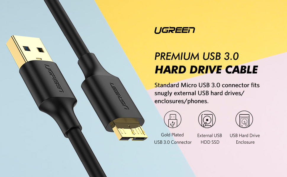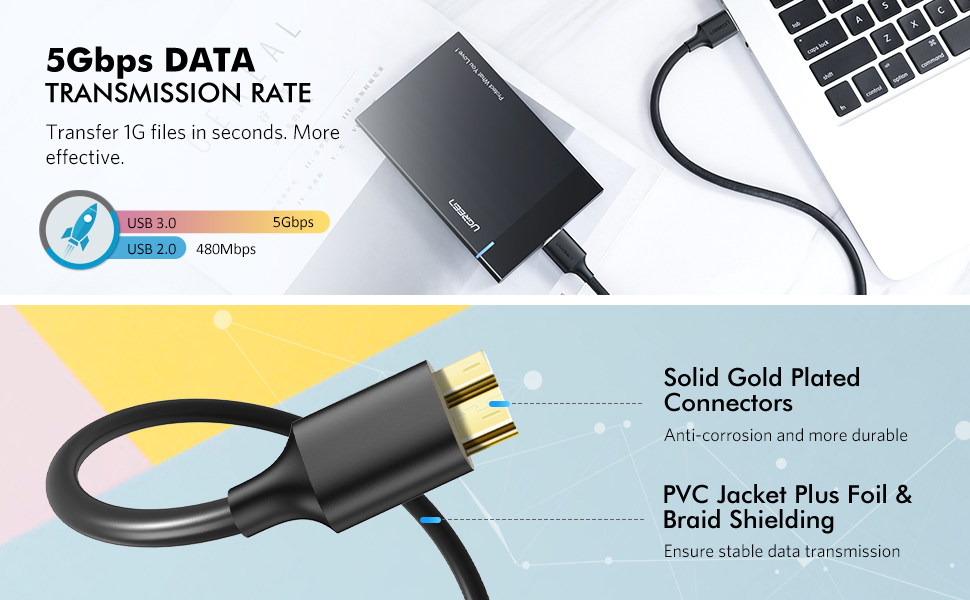 - Velocidad de transferencia de 5 Gbps: el cable micro USB 3.0 de UGREEN soporta una velocidad de transferencia de datos estándar USB 3.0 de hasta 5 Gbps, 10 veces más rápido que USB 2.0. Las películas HD se pueden transferir en solo segundos.