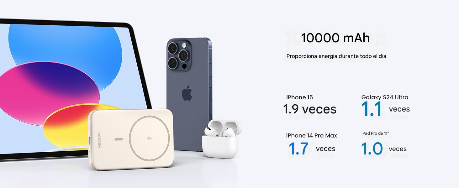 Con 10000 mAh de capacidad, podés cargar completamente tu iPhone 15 Pro hasta 1,9 veces. Perfecto para seguir conectado donde estés: viajes, oficina o salidas largas.