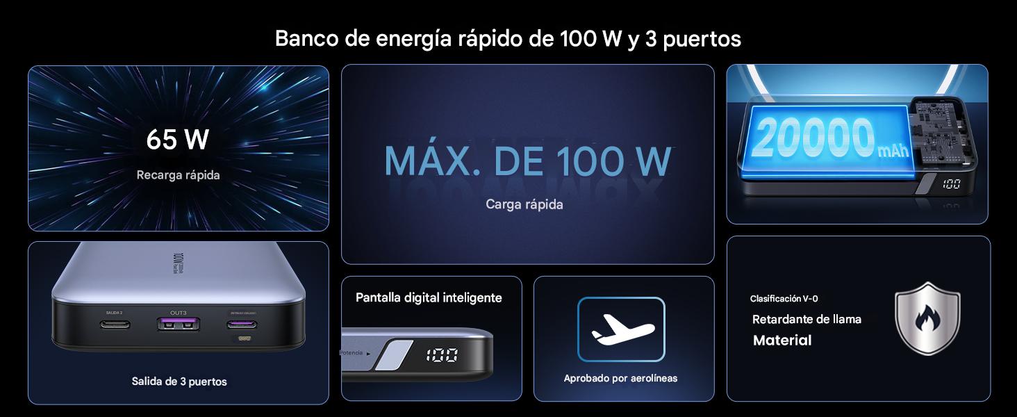 Recarga rápida de 65 W: ¡Carga tus dispositivos mientras recargas la batería externa! Carga completa en 1,6 horas.