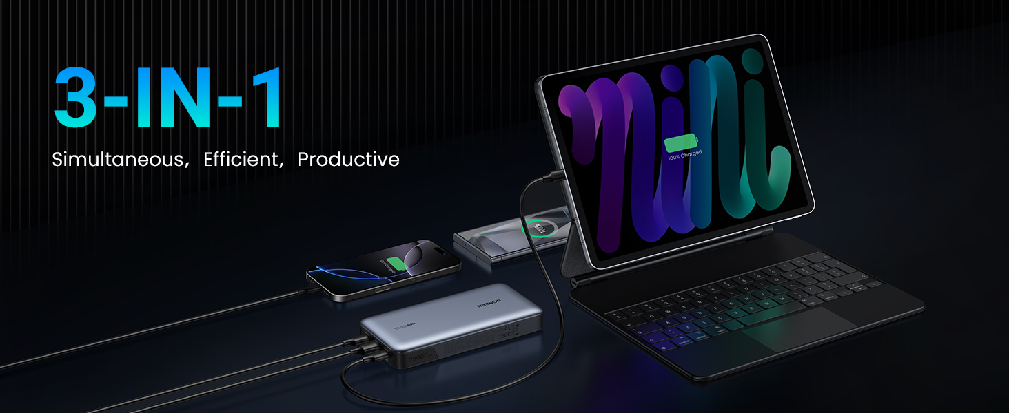 Carga rápida 3 en 1: USB C dual (C1 100W + C2 30W) y un USB A de 22,5W. Carga rápida hasta 3 dispositivos. iPhone 15 al 60% en 30 minutos o MacBook Air M2 al 50% en 30 minutos.