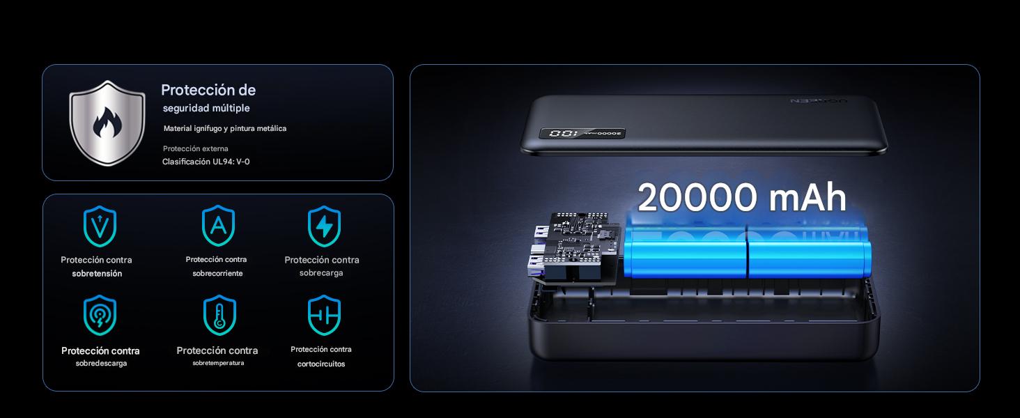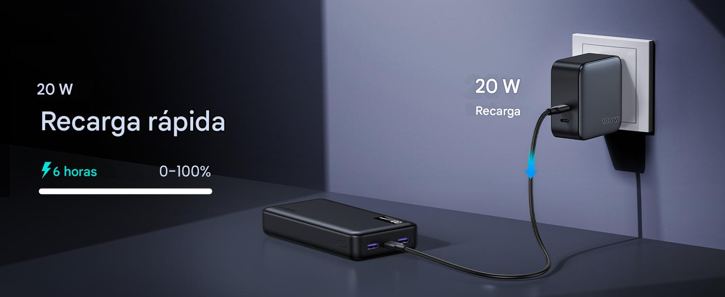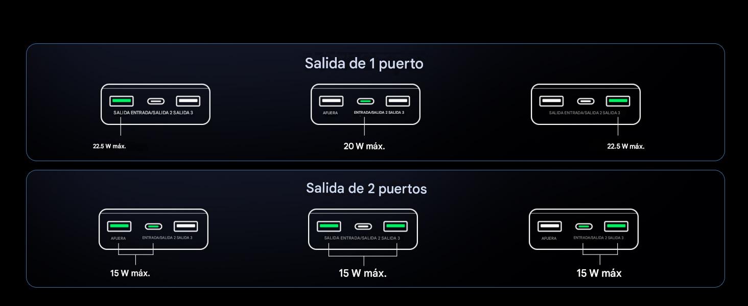Puertos de Salida: 1 USB-C (PD 20W), 2 USB-A (QC 18W).