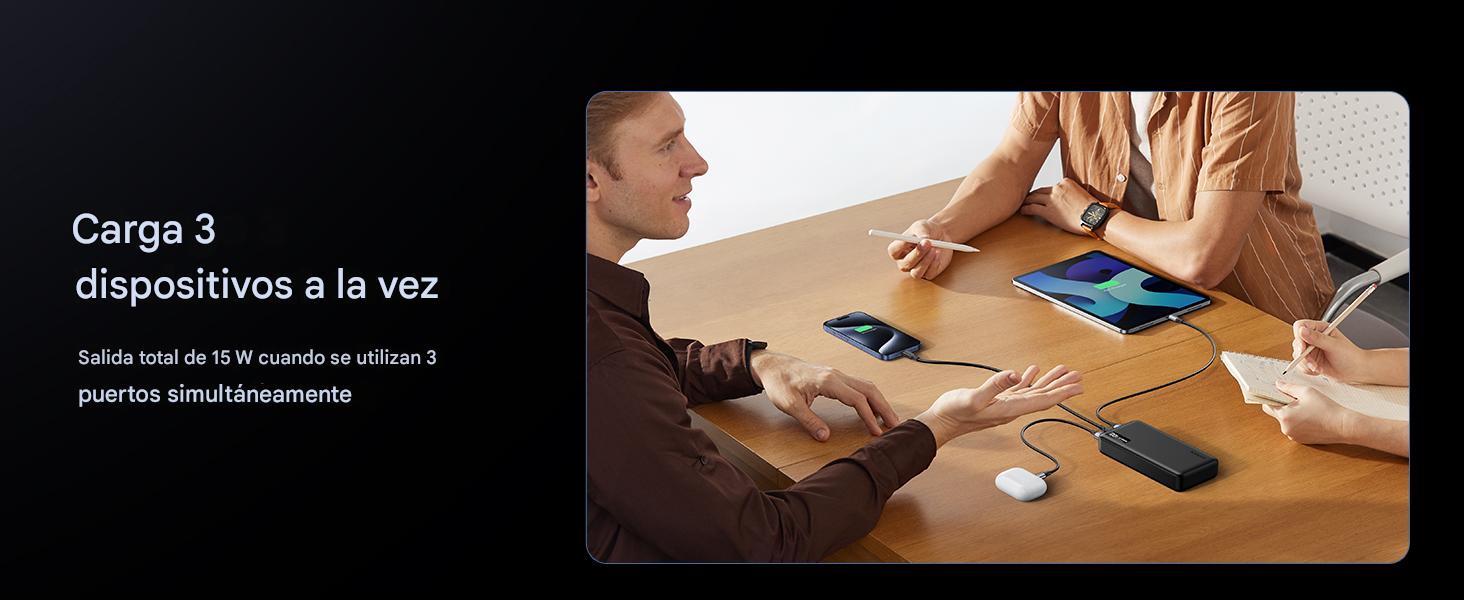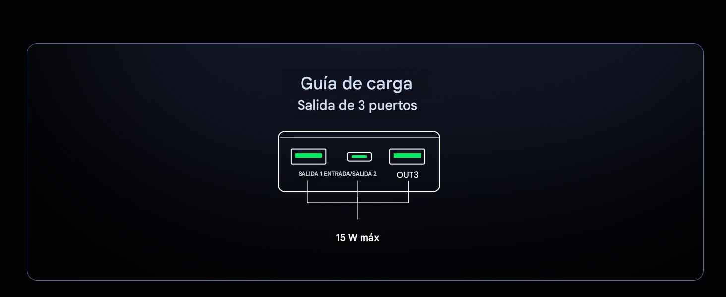 Carga Simultánea: Permite cargar hasta tres dispositivos al mismo tiempo.