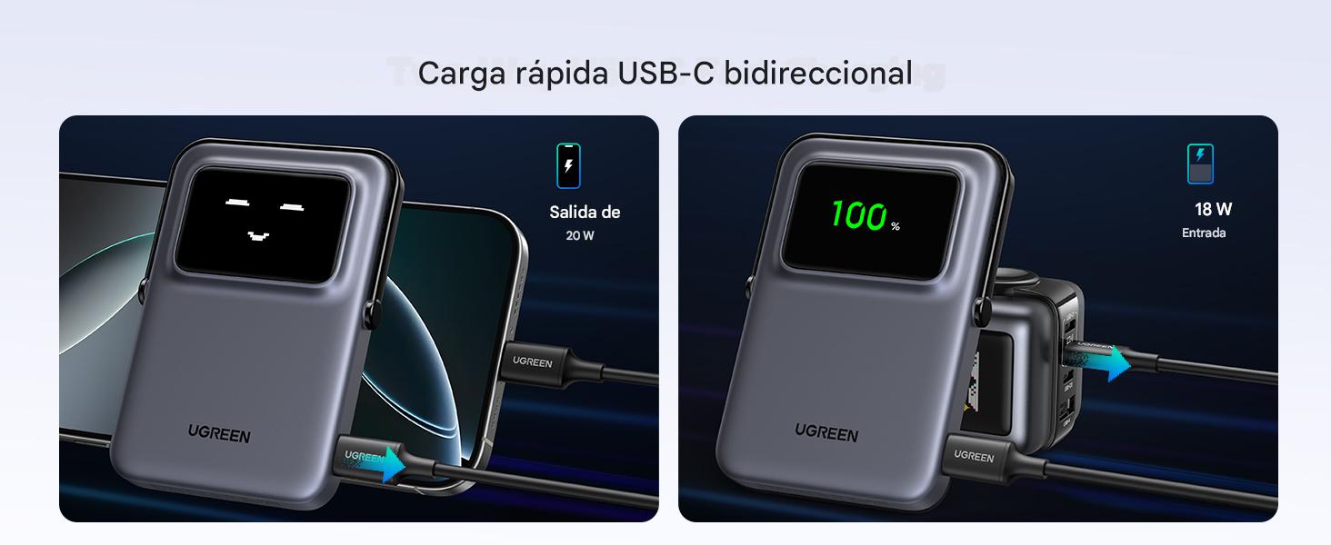 Este power bank te da flexibilidad. Su función principal es la carga inalámbrica magnética, que se alinea perfectamente con tu iPhone para una recarga fácil y sin esfuerzo. Pero si necesitas velocidad, también puedes usar su puerto USB-C de 20W. Este puerto te permite cargar tu iPhone a toda velocidad con un cable. Como resultado, puedes pasar de 0 a 60% de batería en solo 30 minutos.