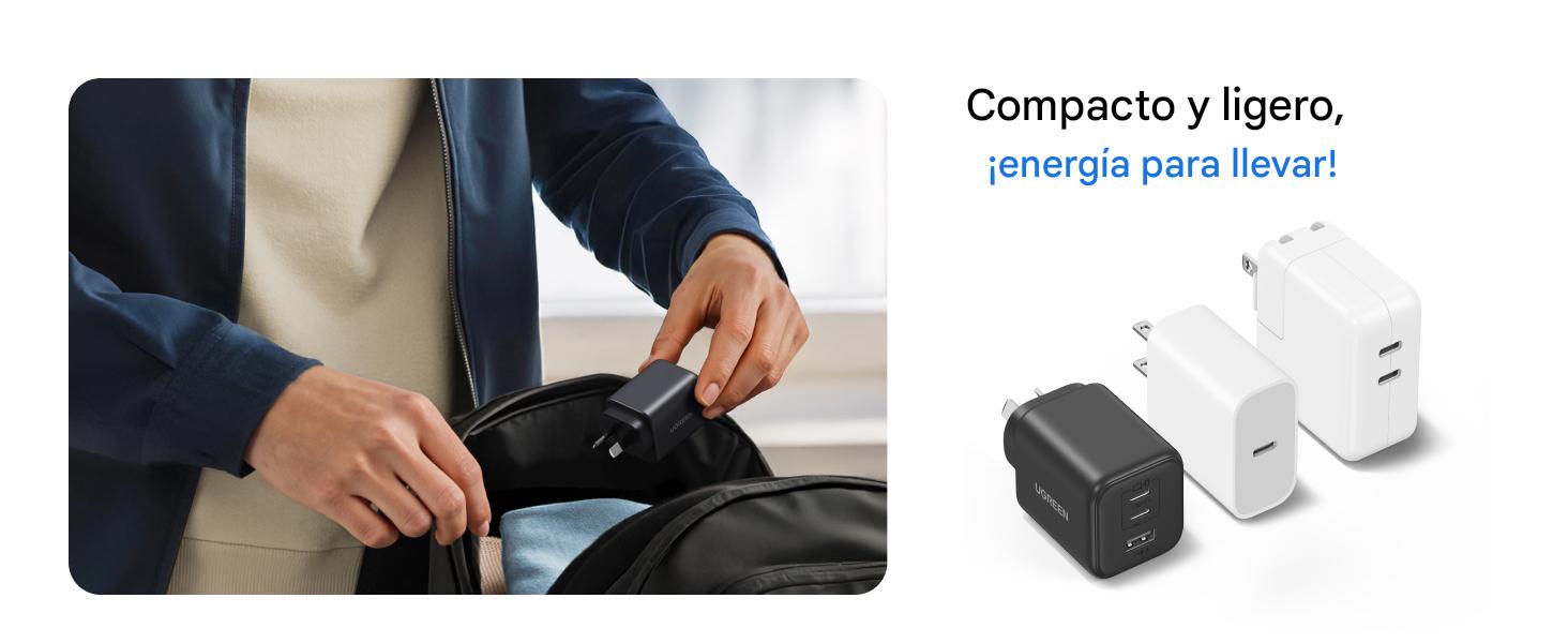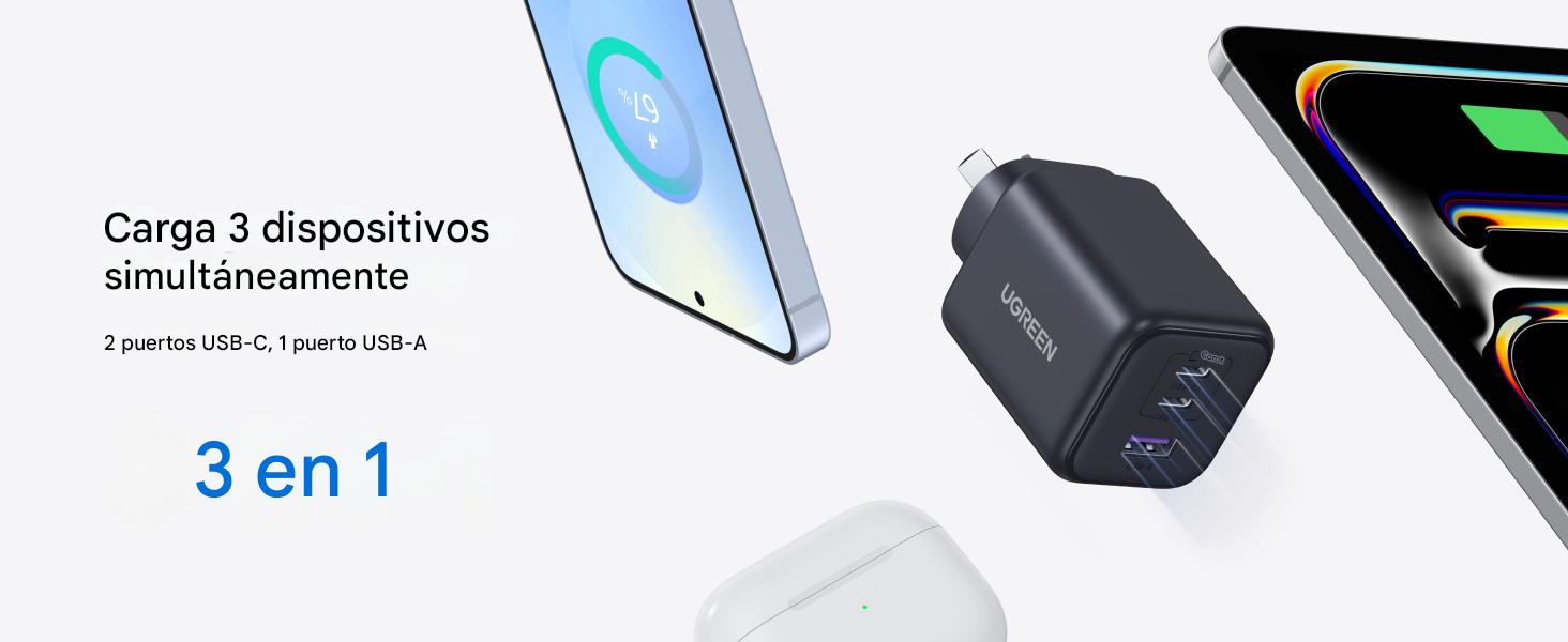 Un cargador, más dispositivos: El cargador USB C UGREEN de 45 W ofrece una enorme potencia de carga de 45 W con dos puertos USB-C y un puerto USB-A. Suficiente para cargar rápidamente 3 dispositivos: teléfonos, tabletas y portátiles al mismo tiempo, ideal para usuarios con varios dispositivos.