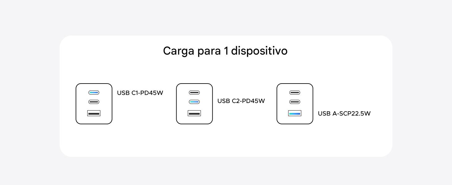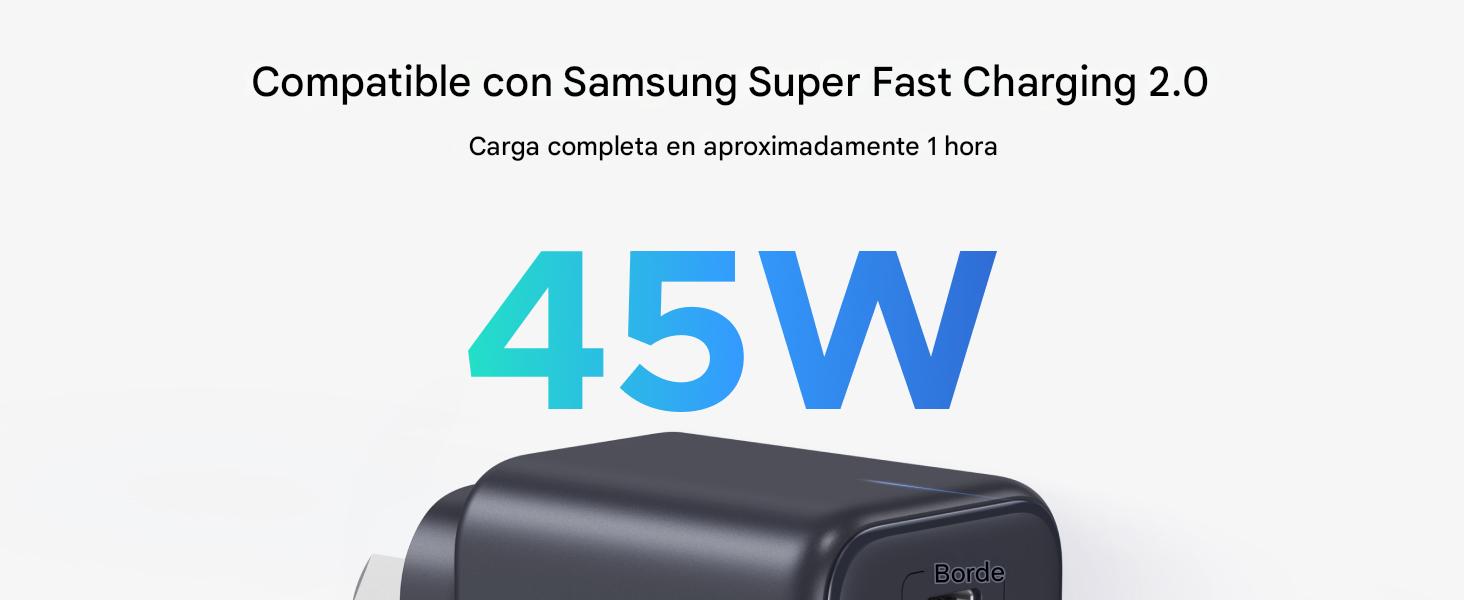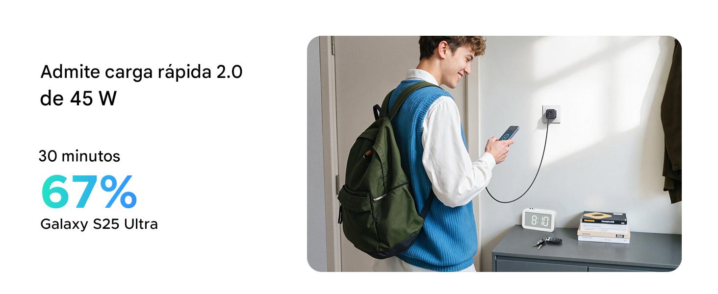 Cargador de alta velocidad de 45 W: Conecta un solo dispositivo USB C para obtener una carga máxima de 45 W; carga tu iPhone 16 al 56 % en 30 minutos. Compatible con carga superrápida 2.0 de 45 W para Galaxy S25 Ultra/ S25+/ S24 Ultra/ S23+.