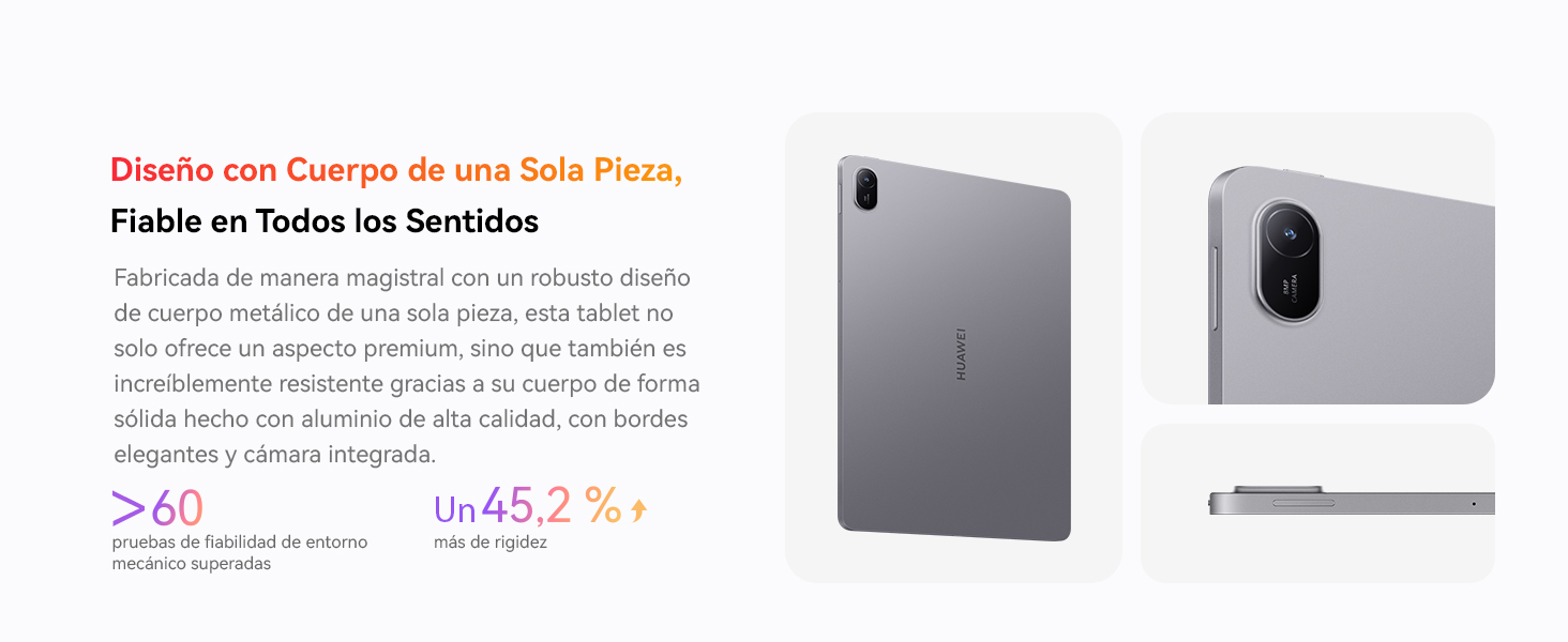 【Diseño con cuerpo de metal de una pieza】Fabricada con maestría en un robusto diseño con cuerpo de metal de una pieza, esta tablet no sólo tiene un aspecto de primera calidad, también es muy resistente gracias a su sólida forma en aluminio de alta calidad con bordes elegantes y cámara integrada.