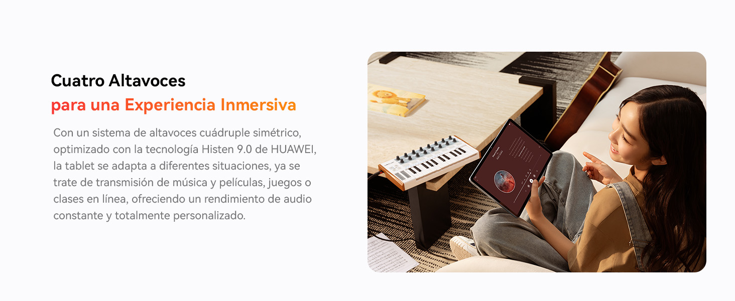 【Sonido impresionante afinado por Histen 9.0】Con un sistema de cuatro altavoces simétrico sintonizado por la tecnología HUAWEI Histen 9.0, la tablet se adapta a diversas necesidades, ya sea streaming de música y películas, juegos o clases en línea, ofreciendo un rendimiento general de audio personalizado y constante, adaptado a los deseos del usuario.